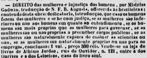 Neste mesmo ano, encontramos mais publicidade da obra Direito das Mulheres e Injustiça dos Homens no Jornal do Commercio.