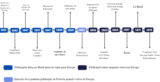 1832 – Adota o pseudônimo “Nísia Floresta Brasileira Augusta” na sua primeira publicação: Direito das Mulheres e Injustiça dos Homens. Essa obra foi considerada uma tradução de Mary Wollstonecraft, uma vez que o livro é atribuído a “Mistress Godwin”. O livro tem a sua primeira edição pela Tipografia Fidedigna, em Recife. Porém, a única edição disponível encontra-se na Biblioteca Nacional e tem como data de publicação o ano de 1833, sendo a segunda edição da obra. A digitalização desta versão foi fruto de um esforço da Cátedra UNESCO para História das Mulheres junto à Fundação Biblioteca Nacional.